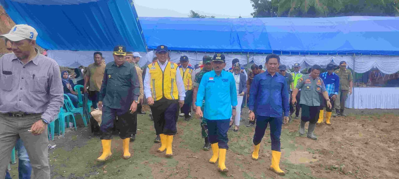 Bupati Butur Muhammad Ridwan Zakariah (baju biru muda) Direktur Pembangunan Jembatan Dirjen Bina Marga Kementerian PUPR Ir Yudha Handita Pandjiriawan MT. MBA, (rompi kuning) Wakil Bupati Butur Ahali dan Ketua DPRD Butur Muhammad Rukman Basri Zakariah (baju biru tua) menuju tempat peletakan batu pertama pembangunan jembatan Langere-Tanah Merah. Foto : Trimediasultra.com