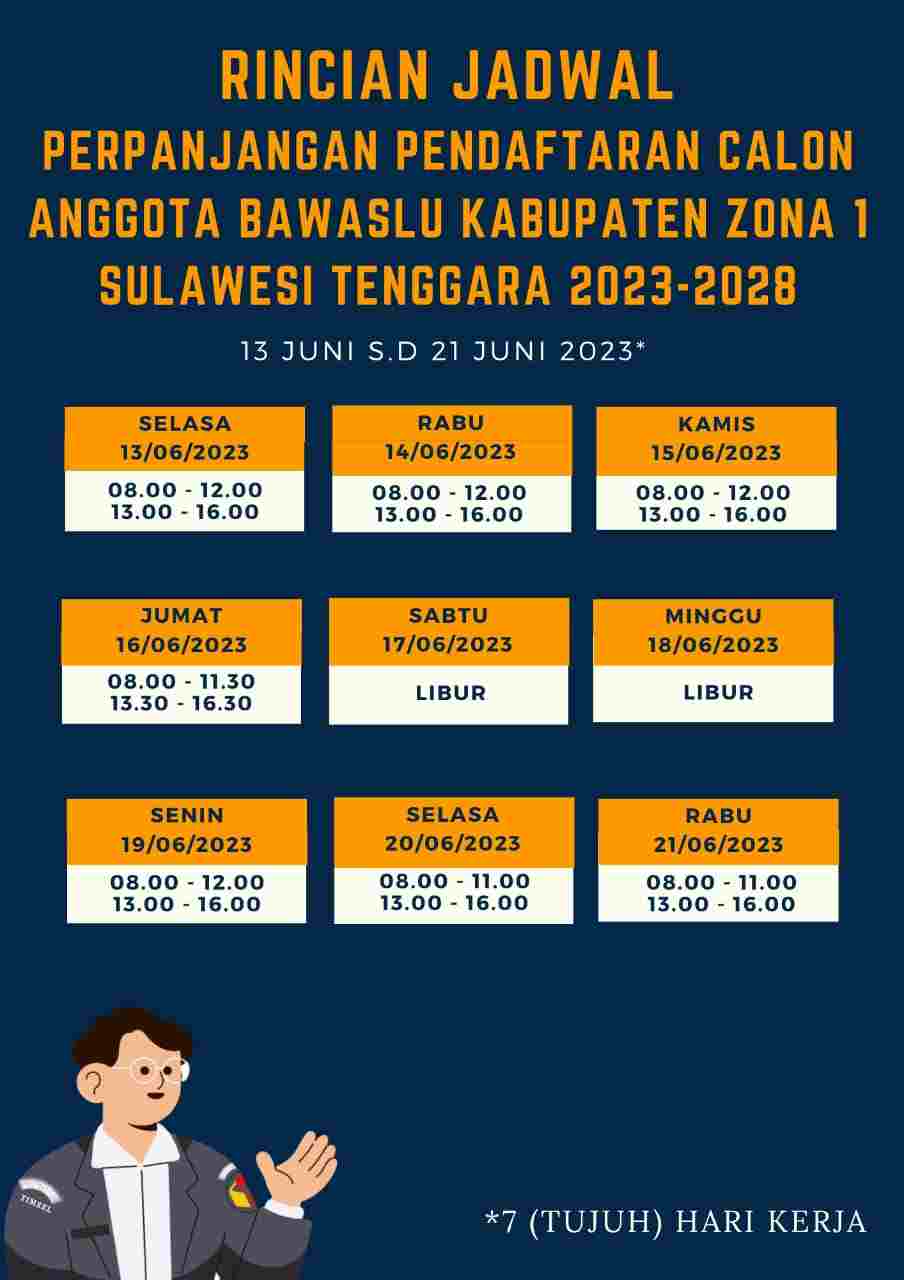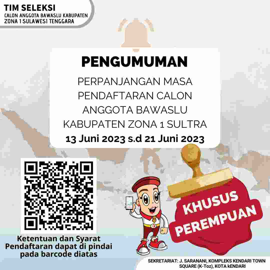 Atas kewenangan yang diberikan oleh Undang-Undang Nomor 7 tahun 2017 tentang Pemilihan Umum, Tim Seleksi Calon Anggota Bawaslu Kabupaten/Kota Zona 1 Sulawesi Tenggara membuka Perpanjangan Masa Pendaftaran Khusus Untuk Pendaftar Perempuan di Kabupaten Bombana, Buton, Buton Selatan, Buton Tengah, dan Buton Utara. Yang bernomor 003/Timsel-1/VI/2023, Adapun ketentuan pendaftaran sebagai berikut :