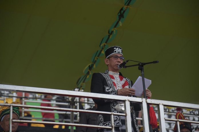 Pj. Bupati Buton, Drs. Basiran, MSi beberkan capaian pembangunan pada upacara peringatan HUT ke-64 Kabupaten Buton dan Hari Jadi ke-20 Pasarwajo sebagai Ibukota Buton, di Lapangan Upacara Alun-alun Takawa, Pasarwajo (Foto :ist)