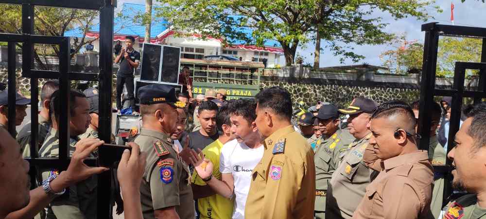Suasana saat barisan P3K-Butur meminta kepada Wakil Bupati Butur, Ahali untuk dipertemukan dengan Bupati Butur, Muhammad Ridwan Zakariah guna membahas berbagai kejanggalan pada proses lelang JPTP. (Foto : Trimediasultra.com)