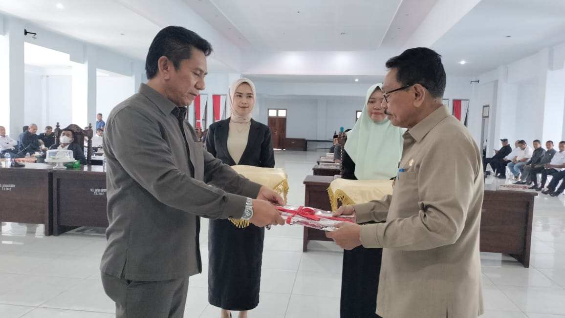 Penyerahan Dokumen Rancangan Perubahan Kebijakan Umum Anggaran (KUA) dan Prioritas Plafon Anggaran Sementara (PPAS) Kabupaten Buton Utara Tahun Anggaran (T.A) 2023 dari Bupati Buton Utara (Butur) Dr. H. Muhammad Ridwan Zakariah, M.Si., kepada Ketua DPRD Kabupaten Buton Utara H. Muhammad Rukman Basri, SE (Foto : Hamsil Humas Pemda Butur)