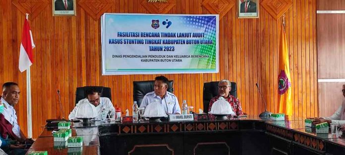Wakil Bupati Buton Utara saat memimpin rapat Diseminasi dan fasilitasi rencana tindak lanjut audit kasus stunting di Kabupaten Buton Utara (Foto:Trimediasultra.com)