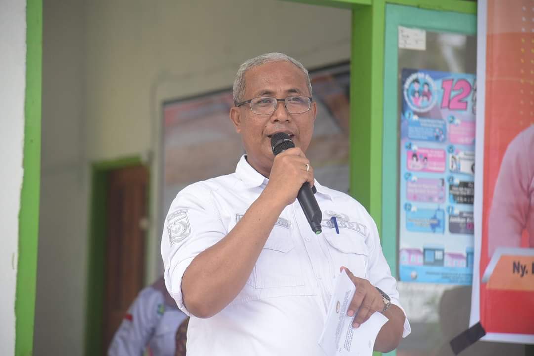 Sekretaris Daerah Kabupaten Buton Asnawi Jamaluddin saat beri sambutan pada kegiatan pemberian paket makanan tambahan pada anak beresiko stunting dan pelayanan posyandu pada anak dan lansia di Puskesmas Wolowa (Foto : ist).