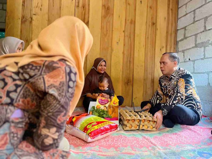 Sekretaris Daerah Buton Utara Muhammad Hardhy Muslim menyerahkan bantuan paket manfaat program BIAAS kepada keluarga penerima manfaat untuk Balita dua tahun beresiko stunting di Desa Damapala Jaya, Kecamatan Kulisusu Barat. (Foto : ist)