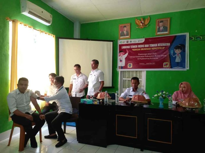 Butur, Trimediasultra.com – Dinas Kesehatan (Dinkes) Kabupaten Buton Utara (Butur) melaksanakan imunisasi vaksinasi Hepatitis B kepada Tenaga Kesehatan (Nakes) dan Tenaga Medis (Named) lingkup Puskesmas (PKM) Kulisusu, guna mencegah penyebaran infeksi virus.