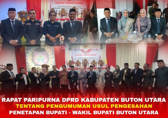 Butur, Trimediasultra.com – Dewan Perwakilan Rakyat Daerah (DPRD) Kabupaten Buton Utara (Butur) gelar rapat paripurna untuk mengumumkan secara resmi penetapan pasangan terpilih dengan jargon AMAN (Afirudin Mathara-Rahma) sebagai Bupati dan Wakil Bupati Buton Utara periode 2025-2030, yang berlangsung di ruang sidang DPRD setempat, Rabu 11 Januari 2025.