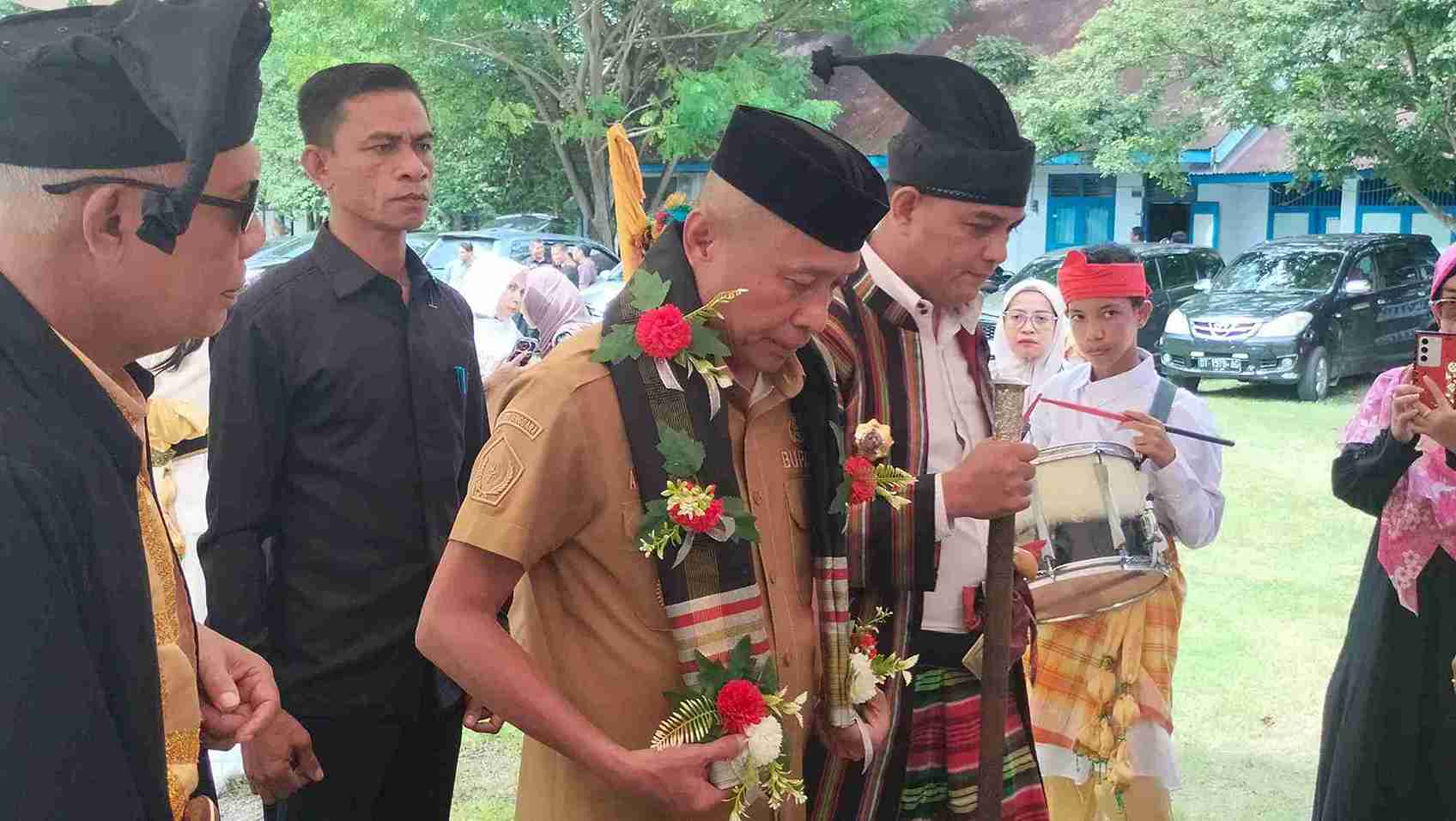 Bupati Buton Utara Afirudin Mathara, SH., MH., disambut dengan pengalungan bunga saat menghadiri Halal bihalal keluarga besar Kesultanan Buton bersama Gubernur Sulawesi Tenggara, bertempat di gedung istana Ilmiah Kamali Kesultanan Buton, Kota Baubau. Senin, 14 April 2025