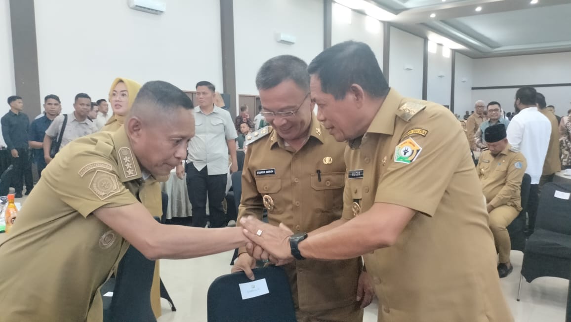 Bupati Buton Utara, Afirudin Mathara, SH., MH berjabat tangan dengan Wakil Gubernur Sulawesi Tenggara, Ir. Hugua di kegiatan Musrembang RKPD Provinsi Sultra di Kota Baubau.