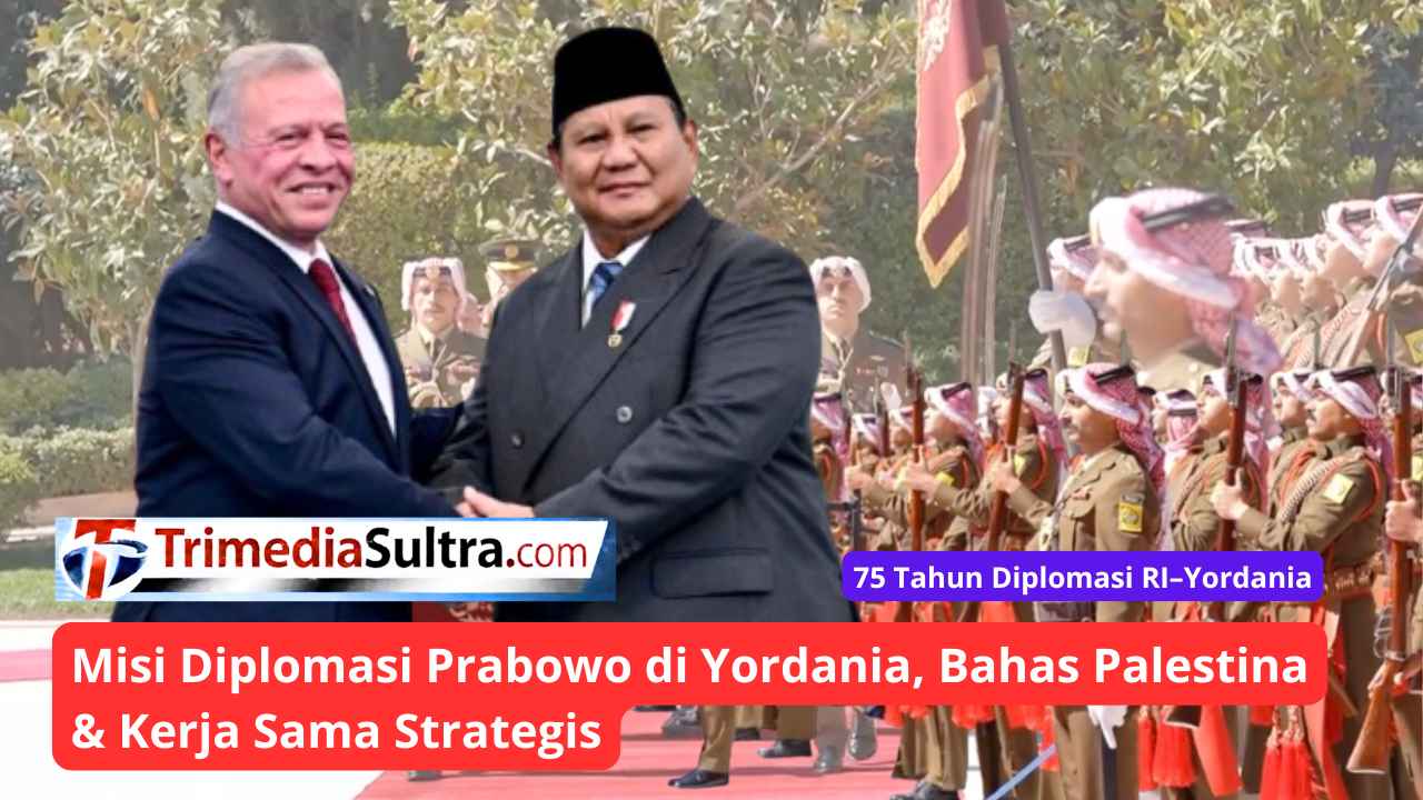 Jakarta,Trimediasultra.com – Presiden Republik Indonesia Prabowo Subianto disambut dengan upacara kenegaraan resmi oleh Raja Kerajaan Yordania Hasyimiah Abdullah II ibn Al Hussein di Istana Basman, Amman, pada Rabu, 25 Februari 2026. Kunjungan ini berlangsung dalam suasana penuh kehormatan dan persahabatan, bertepatan dengan peringatan 75 tahun hubungan diplomatik Indonesia–Yordania.